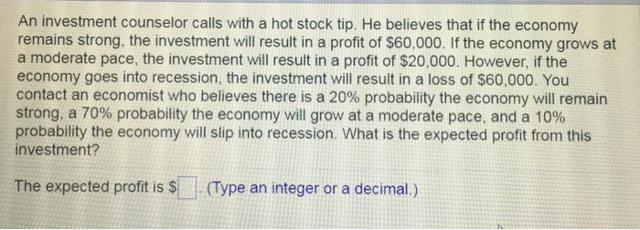 He believes that if the economy remains strong the investment will result in a profit of 60000. An investment counselor calls with a hot stock tip. An investment counselor calls with a hot stock tip.