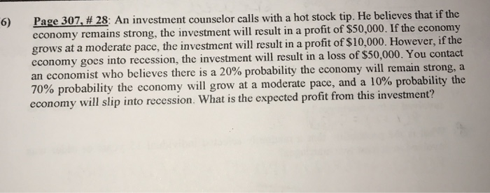 He believes that if the economy remains strong the investment will result in a profit of 50000. Solution for An investment counselor calls with a hot stock tip. 1 on a question An investment counselor calls with a hot stock tip.