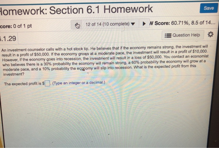 However if the economy goes into recession the investment will result in a loss of 60000. Type an integer or a decimal - ScieMce. What is the expected profit from this investment.